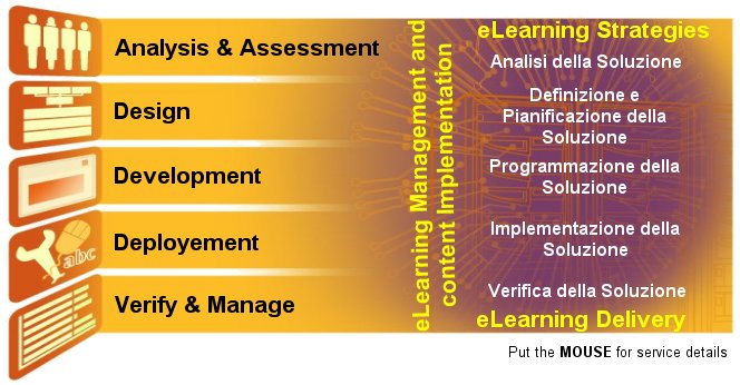 Un progetto di eLearning per essere concretamente realizzato richiede la conduzione di numerose attività e la conseguente integrazione di varie tipologie di servizi e di professionalità. A tal fine sono stati previsti una serie di servizi per l'integrazione dei diversi modelli formativi e la realizzazione dei relativi supporti nella progettazione, nella realizzazione e nella gestione del sistema formativo: